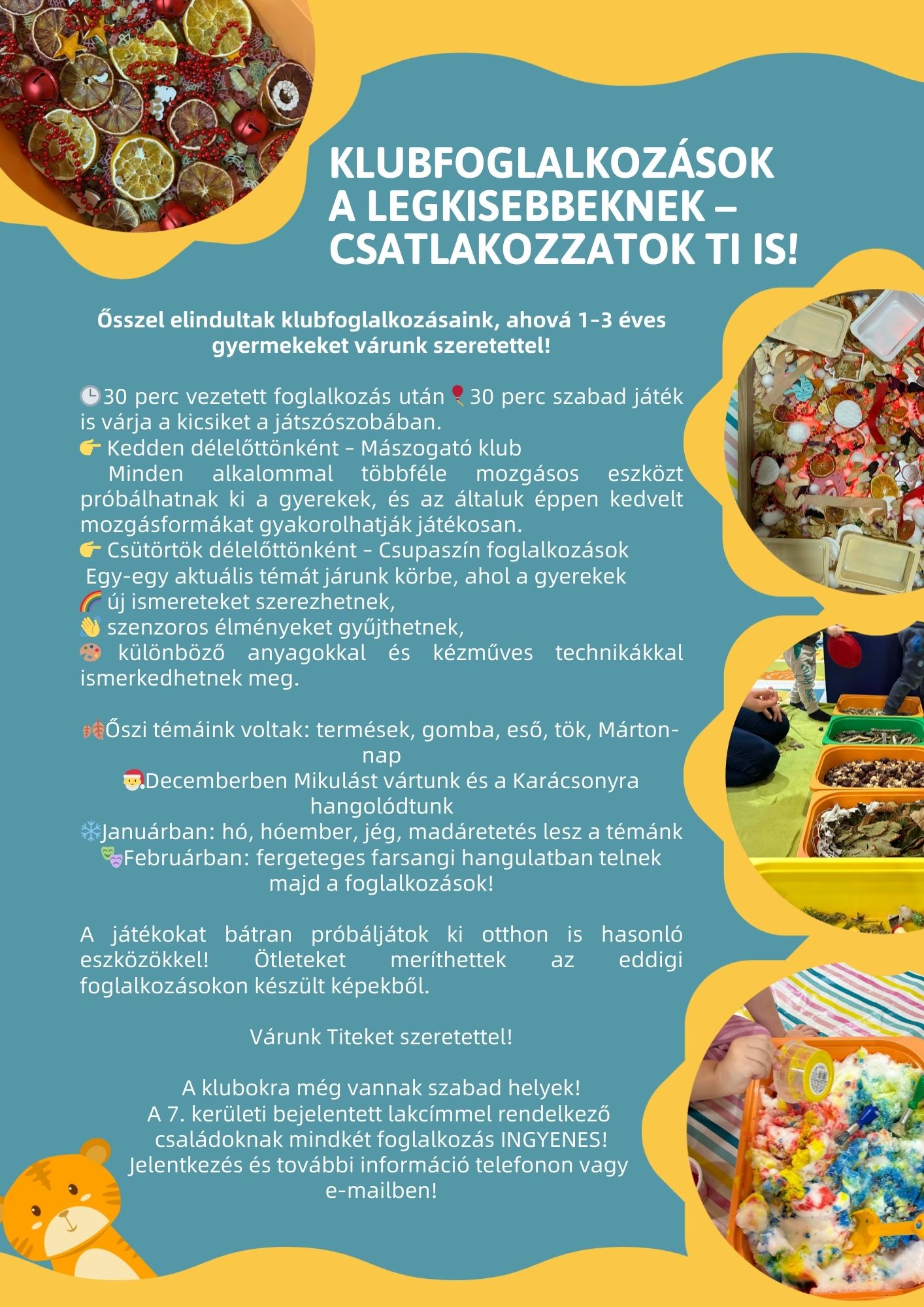 2026. január 1-től minden klubfoglalkozásunk elérhető: a Mászogató klub, a Csupaszín klub, valamint a MOZAIK oviklub is.